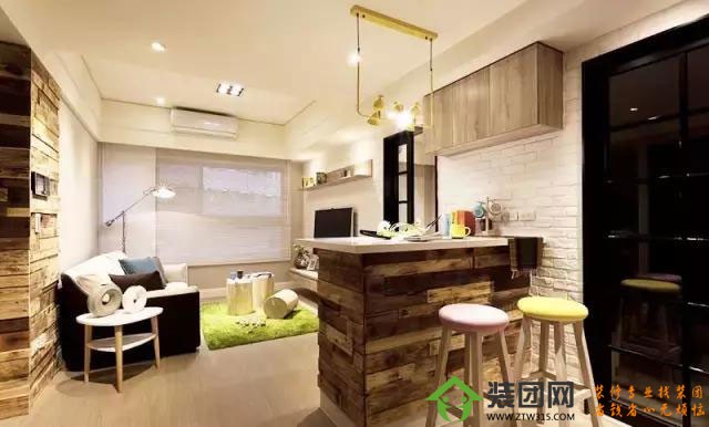 ▲ 一打开门就像进入到森林中一样,木头元素充满了整个屋子。由于房子很小,没有设置专门的玄关,而是设计了摆台和高脚凳,在视觉上就像是一个小巧的玄关,不会让人一进门就将客厅一览无遗,很好的保存了视觉上的隐私性。这样质朴简洁的一室一厅,当然是单身族的最爱,如果是新婚夫妇的话,也是可以勉强住下的。